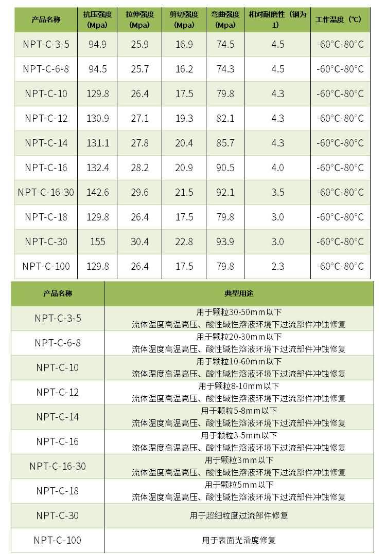 耐磨材为双组分,以陶瓷、金属碳化物、微型颗粒为骨材的耐磨复合材料,具有耐水、耐油、耐酸碱性。适用(-60℃~80℃)设备过流冲蚀、设备的大面积修复、设备预涂耐磨层,如旋流器、浮选柱、浮选机、泡沫槽、分级机、搅拌桶、溜槽、管件类、泵类等修复(典型用途见主要物理机械性能表)。